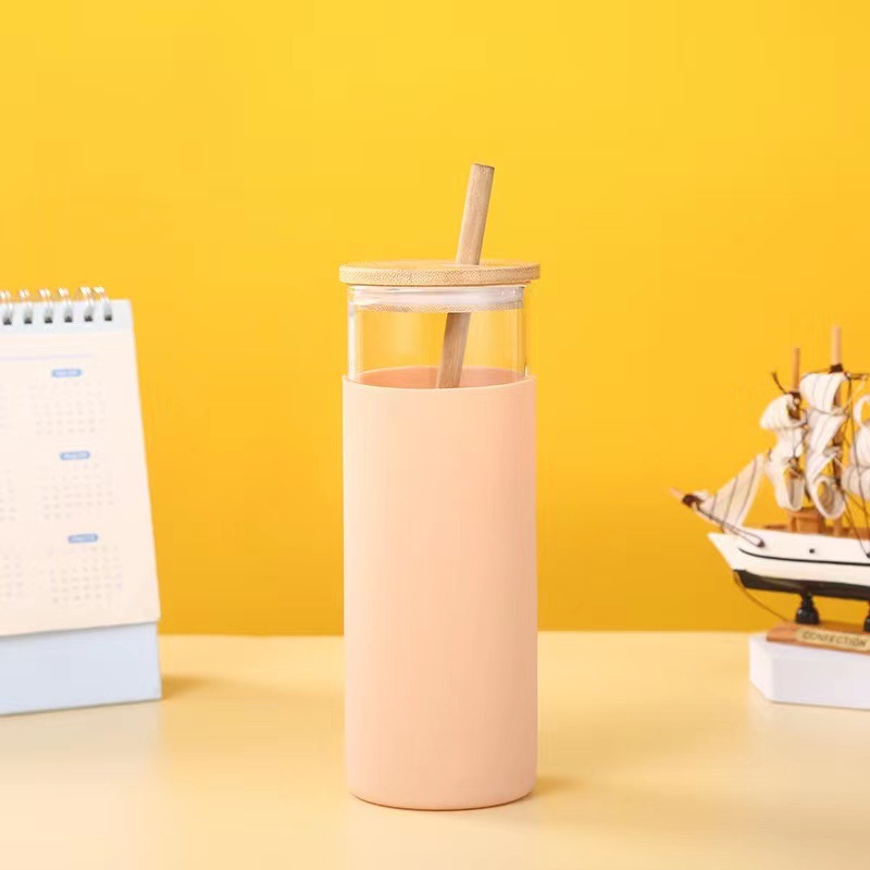สวมด้วยปลอกซิลิโคนสี Earth Tone พร้อมฝาแก้วทำจากไม้ไผ่ Food Grade สีเข้ากัน